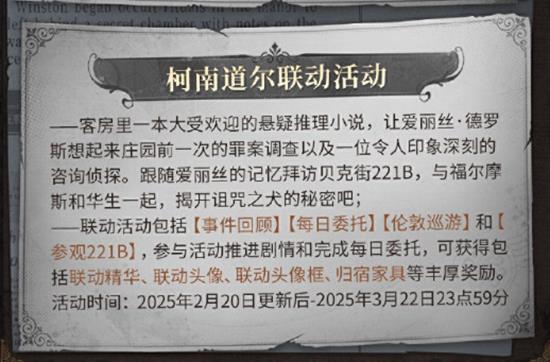 活动背景:客房里一本大受欢迎的悬疑推理小说,让爱丽丝·德罗斯想起了庄园前一次的罪案调查以及一位令人印象深刻的咨询侦探。玩家将跟随爱丽丝的记忆拜访贝克街221B,与福尔摩斯和华生一起,揭开诅咒之犬的秘密。