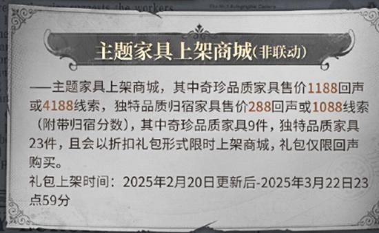 家具详情:本次上架的家具包括奇珍品质家具和独特品质家具。奇珍品质家具售价1188回声或4188线索,独特品质归宿家具售价288回声或1088线索(附带归宿分数)。共有奇珍品质家具9件,独特品质家具23件。