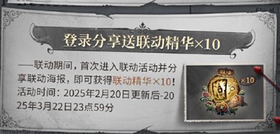 活动内容:在联动活动期间,玩家首次进入联动活动并分享联动海报,即可获得联动精华x10。