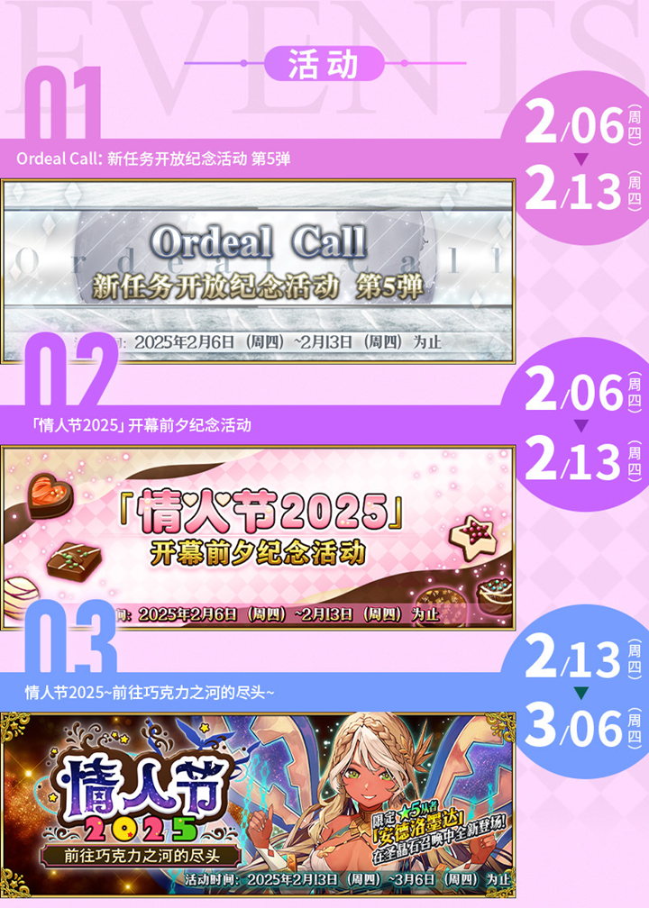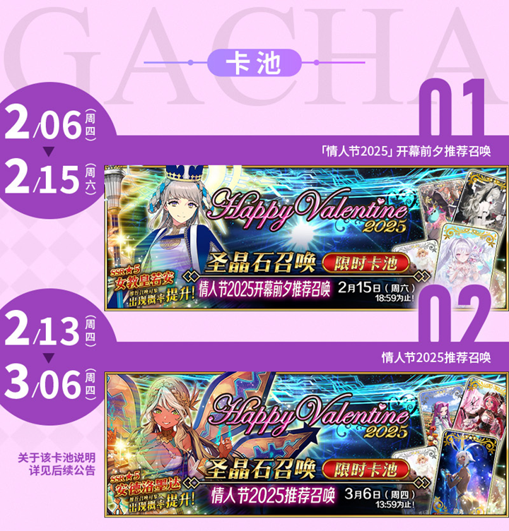 - 2月13日(周四):正式开启「情人节2025推荐召唤」,推出新限定从者及主题礼装。