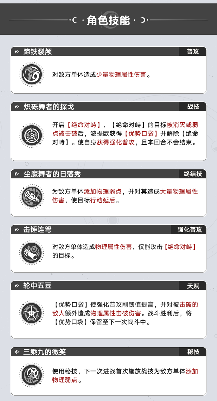 波提欧作为物理属性的击破主C角色,通过合理的行迹升级和遗器搭配,可以充分发挥其在单体击破和削韧方面的优势。在战斗中,善用其技能与天赋,配合适当的队友,能够有效地击败敌人,取得战斗的胜利。