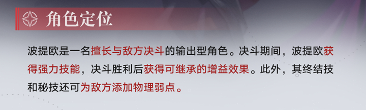 波提欧是《崩坏:星穹铁道》中的五星物理属性巡猎角色,以其独特的决斗机制和强大的击破能力著称。他擅长与敌人进行一对一的对决,通过击破敌人的弱点来获得增益效果,从而提升自身的输出能力。