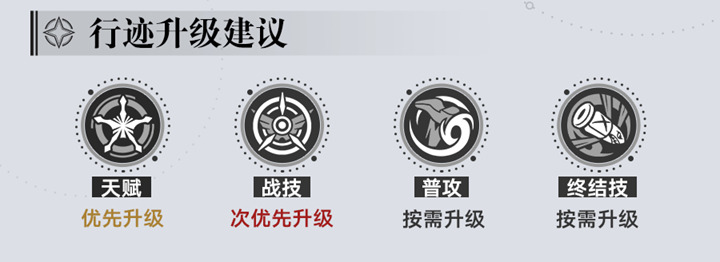 在行迹升级方面,建议优先提升天赋,以增强击破伤害的效果。其次,提升战技的等级,确保在“绝命对峙”中占据优势。普攻和终结技可根据实际需求进行升级。