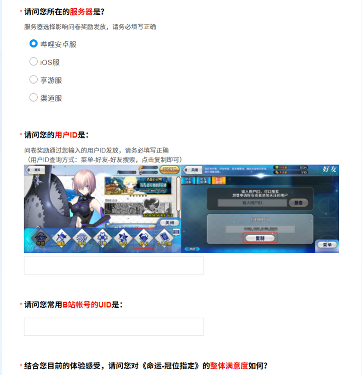 除了呼符奖励外,所有成功提交问卷且填写正确游戏账号信息的御主,还将有机会被抽中,获得 新年贺卡+从者卡贴 1份。活动主办方将从所有合格问卷中抽取10名幸运御主,并通过 B站私信 联系中奖者,请御主填写问卷时确保提供有效的B站账号。 - 填写要求:
