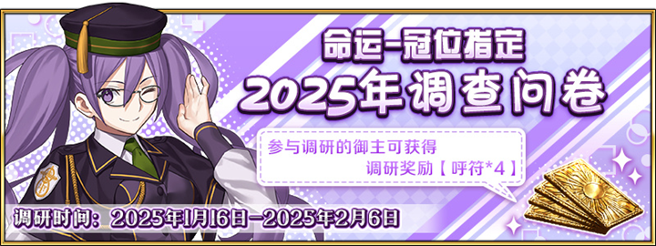 - 所有成功填写并提交问卷的御主,将在2月13日23:59前收到 呼符*4,奖励将通过游戏内的礼物盒发放。