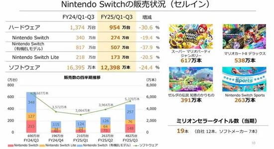 在财报所示时间段内,任天堂共售出954万台游戏机,同比减少30.6%;共售出12398万份游戏,同比减少24.4%。截至2024年12月末,Nintendo Switch总销量已突破1.5086亿台,该平台游戏总销量已突破13亿5980万份。