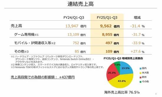 2月4日,任天堂公布了2025财年第3季度的财报。数据显示,2024年4月至12月,任天堂销售额为9562亿日元,同比减少31.4%;营业利润为2475亿日元,同比减少46.7%。任天堂预计本财年全年营业利润为2880亿日元,较去年同期下降20%。