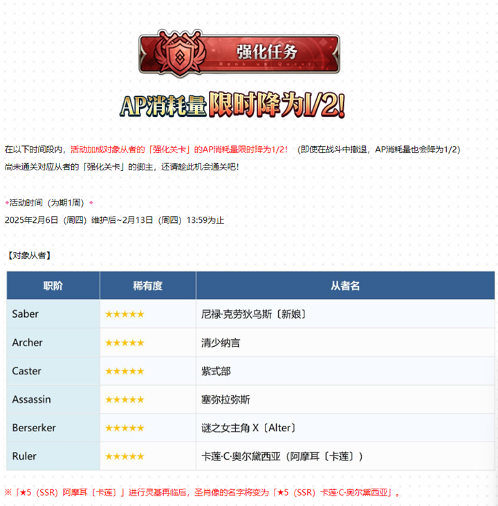 此外,活动期间还将为玩家带来额外福利。在2025年2月6日(周四)维护后至2月13日(周四)13:59,活动加成对象从者的「幕间物语」的AP消耗量将限时降为1/2,即使在战斗中撤退,AP消耗量也会降为1/2。这为尚未通关对应从者的「幕间物语」的御主提供了绝佳机会,可以趁此机会轻松完成通关。同时,在同一时间段内,活动加成对象从者的「强化关卡」的AP消耗量也将限时降为1/2,为玩家提供了强化从者的机会。