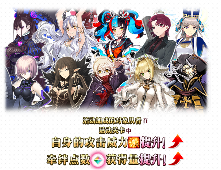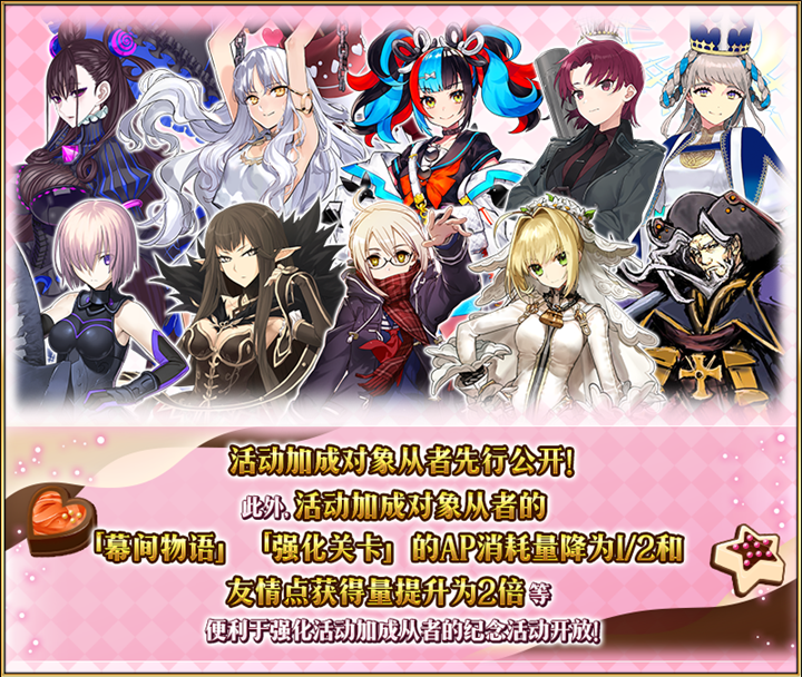在「情人节2025」活动期间,部分从者将获得特殊加成效果。这些从者在活动关卡中将被赋予「自身的攻击威力提升」以及「牵绊点数获得量提升」的效果。强化对象从者将为玩家带来更强大的战斗表现和更快的牵绊提升速度,是挑战活动关卡的绝佳选择。