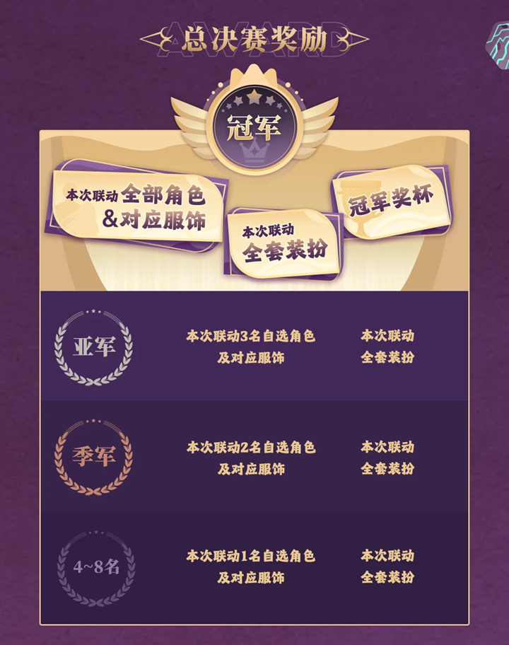 总冠军:本次联动所有角色及其对应服饰、全套装扮及冠军奖杯。