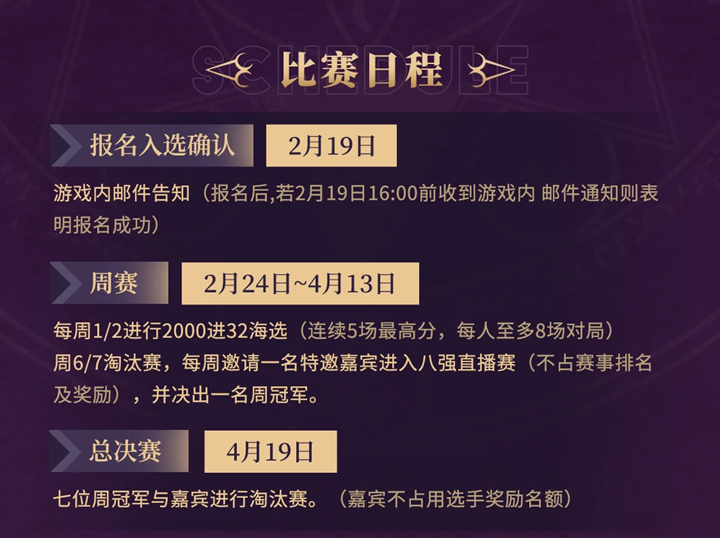 报名入选确认:2月19日,成功报名的选手将收到游戏内邮件通知;未收到邮件则表示报名失败。