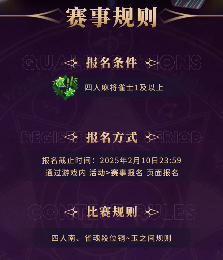 比赛将遵循四人南、雀魂段位铜~玉之间的标准规则进行,确保每位参赛者都能在一个公平竞争的环境中展示自己的实力。