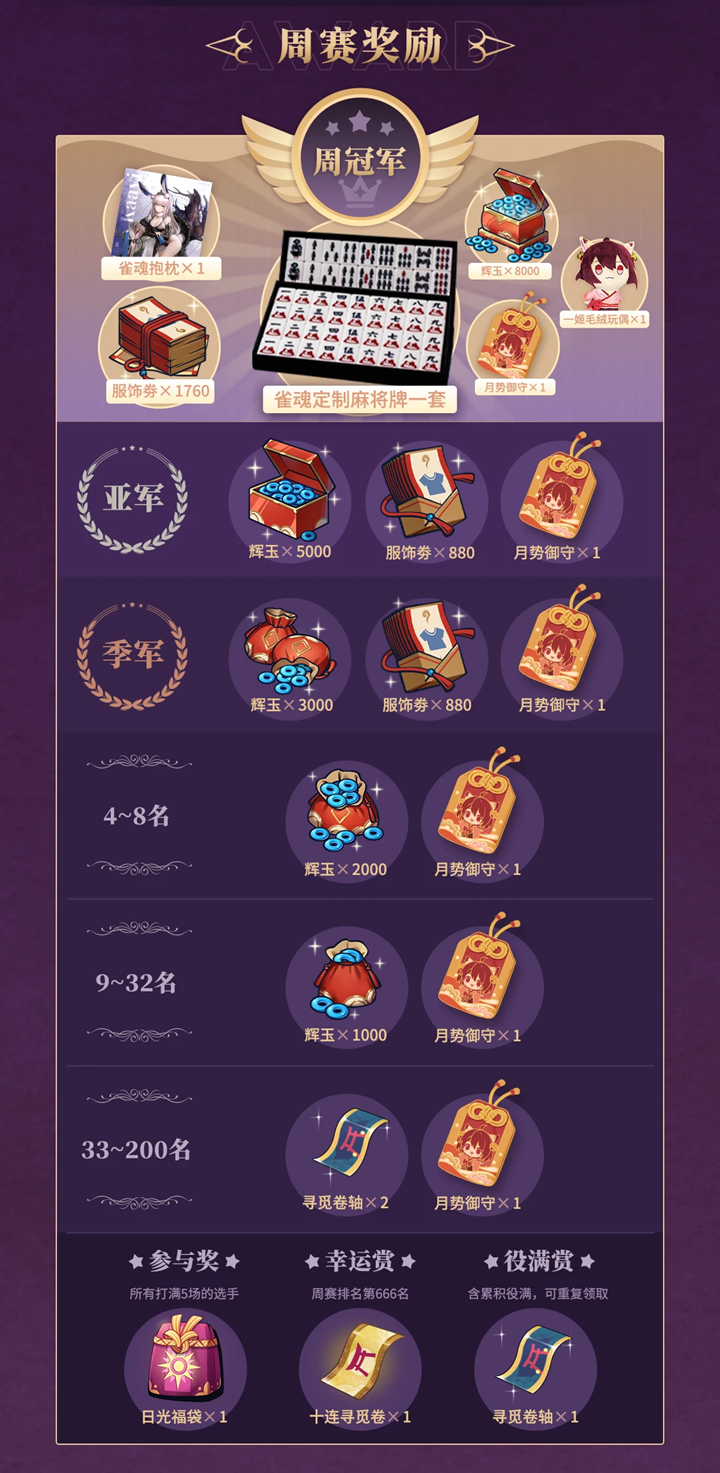 亚军至第8名以及第9至第32名均有不同等级的辉玉、服饰券、月势御守等奖励。