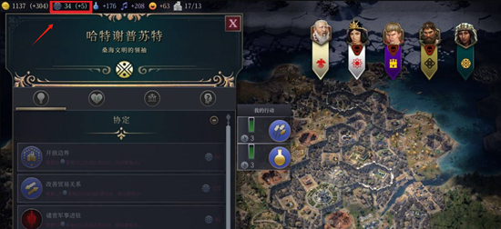 影响力也被成为外交系统的货币,通过花费影响力可以在外交页面与其他文明进行合作、战争与谍战,也可以花费文明让周围的村落加入你的帝国或暗中操作使周围村落与其他文明为敌。