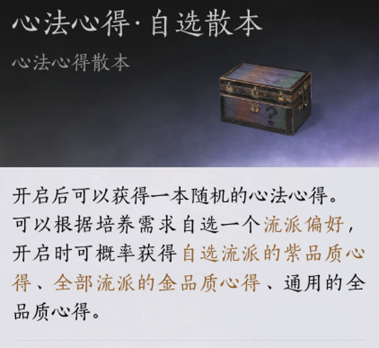 开启后可以获得一本随机的心法心得。可以根据培养需求自选一个流派偏好,开启时可概率获得自选流派的紫品质心得、全部流派的金品质心得、通用的全品质心得。