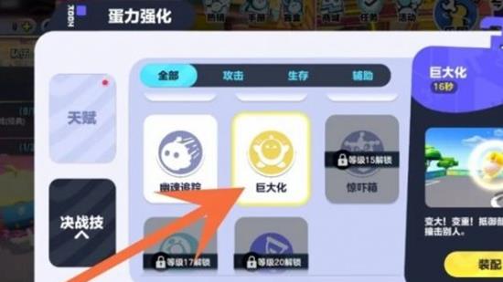 完成装配后,退出到游戏大厅。在技能列表中点击【巨大化】技能图标,即可使用该技能,使蛋仔变大。