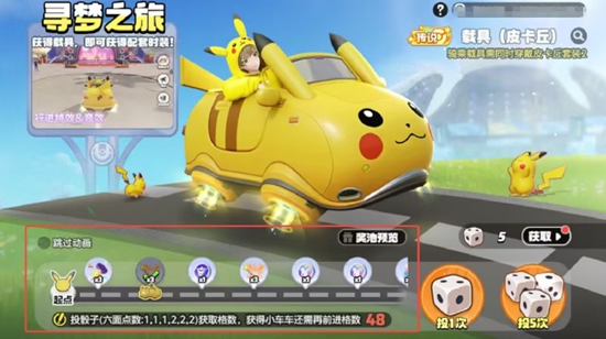 活动期间,每日登录可免费领取1个【神秘骰子】,总计可获得3个;除此之外,【神秘骰子】道具还可以通过购买对应的道具获赠。使用骰子后,可使得界面下方小车车获得指定前进格子数,训练家们可获得踩到格子的对应奖励,但无法获得经过的格子奖励。成功抵达终点后,即可获得【载具(皮卡丘)】以及同款配套载具服【皮卡丘套装2】。