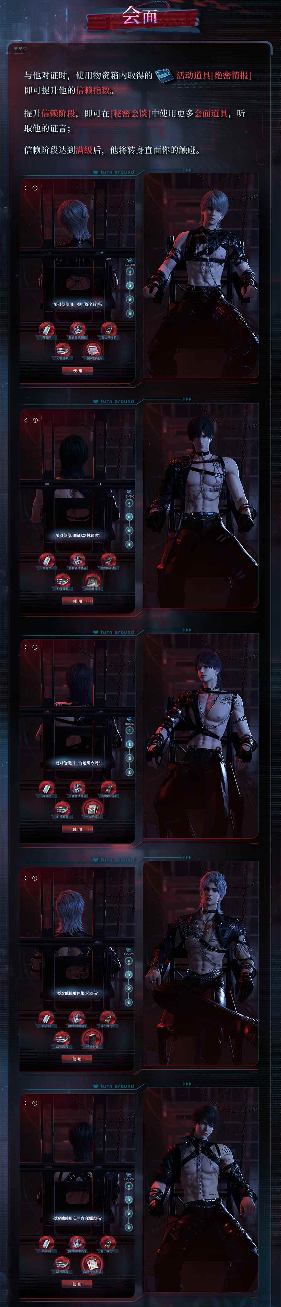 会面环节则是一项至关重要的剧情交互玩法。玩家需要通过提供绝密情报来提升男主的信赖指数,从而解锁更深层次的互动。当信赖值达到最高等级后,男主将不再回避你的触碰,真正直面你的问题,并提供更重要的情报。在这一过程中,玩家能够更加深入地了解角色心理,同时也能通过不同的交互选择影响剧情走向。这不仅增加了游戏的沉浸感,也让每一次会面都充满了期待。