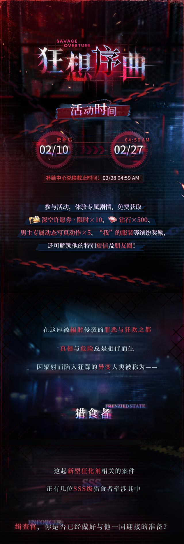 《恋与深空》全新活动「狂想序曲」即将在2025年2月10日更新后开启,为玩家带来扣人心弦的剧情体验、刺激的探索玩法以及丰富的奖励机制。在这场与男主们并肩作战的任务中,玩家将深陷猎食者谜案,逐步揭开层层隐藏的真相,同时还能获得珍贵的道具与专属动态写真动作。本次活动涵盖多个核心玩法,包括专属剧情任务、禁区潜入、会面交谈以及兑换商店,每一环节都充满挑战与惊喜。