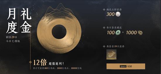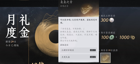购买月度礼金后,玩家可以累积获得300长鸣珠、3000长鸣玉、30000宝钱,累积登录还可以获得“袅袅之音”卡片。