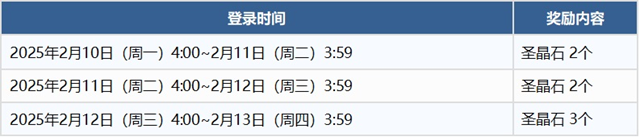 御主们在活动期间累计登录三天,即可共计获得7个圣晶石。请注意,登录奖励将于每日4:00发放,且需在各登录奖励开始日的3:59前完成通关才能领取。无论登录次数如何,每日仅能领取对应日期的奖励。