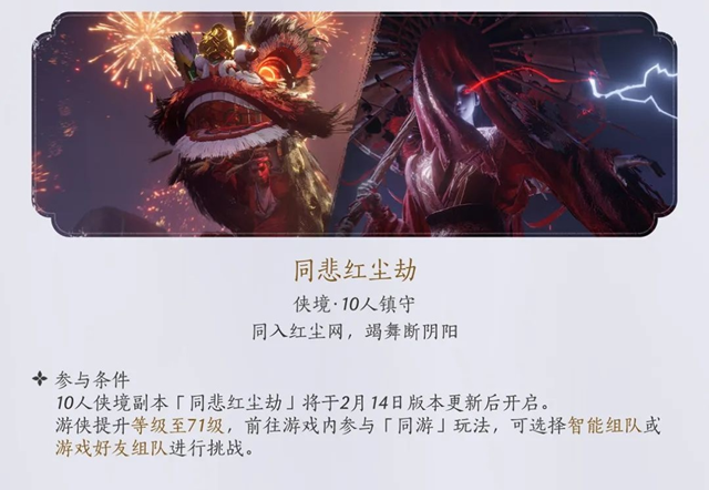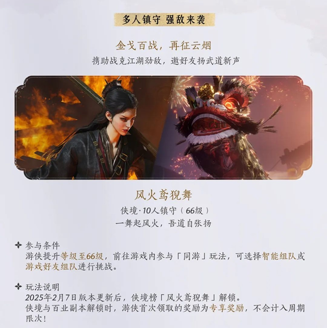 本次更新新增了两大全新侠境·10人镇守挑战——“风火鸢貌舞”与“同悲红尘劫”。其中,“风火鸢貌舞”将在2月7日版本更新后开放,玩家需达到66级后,前往游戏内参与“同游”玩法,能够通过智能匹配或与好友组队进行挑战,迎战风火之力的强敌。而“同悲红尘劫”将于2月14日开放,该副本要求玩家达到71级,并同样支持智能匹配或好友组队参战。在这两大挑战中,玩家需要运用巧妙战术与团队协作,才能成功守卫战场并赢取丰厚奖励。