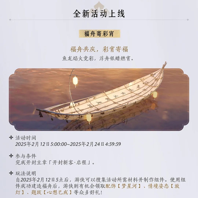 为了庆祝新春佳节,全新限时活动“福舟寄彩宵”将在2月12日至2月24日期间开启。玩家需完成开封主线任务“开封新客·启程”后,便可收集活动材料,制作组件并建造福舟。成功建造后,可获得丰富奖励,包括限定配饰【梦星河】、情境姿态【放灯】、题跋【心想已成】等,让新春夜晚更加璀璨。