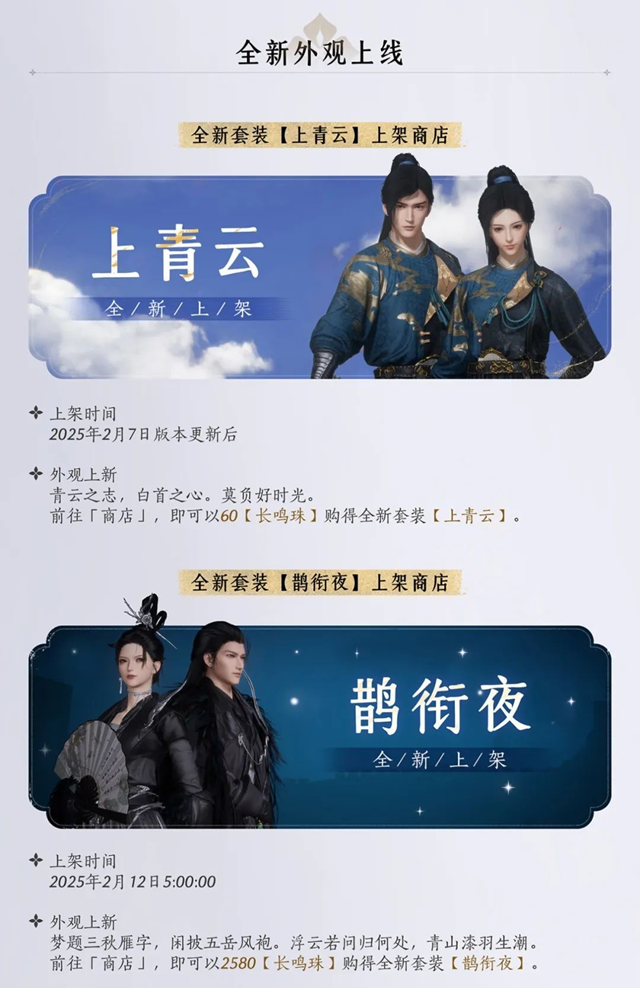 两套全新时装即将上线商店供玩家选购。其中,2月7日更新后,玩家可在商店以60【长鸣珠】获取全新套装【上青云】,这套时装象征青云之志,充满豪情壮志。而在2月12日5:00起,全新套装【鹊衔夜】也将上架,售价2580【长鸣珠】。该套装灵感源于秋日归雁与山海风潮,适合喜欢潇洒江湖风格的玩家。