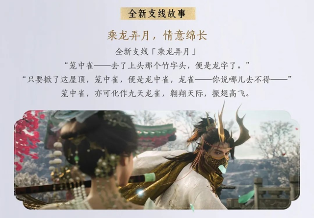 此次更新还将带来全新支线任务“乘龙弄月”,讲述了一只笼中雀如何挣脱束缚,化身九天龙雀的传奇故事。玩家将在任务中经历曲折剧情,最终揭开江湖中被遗忘的秘密。