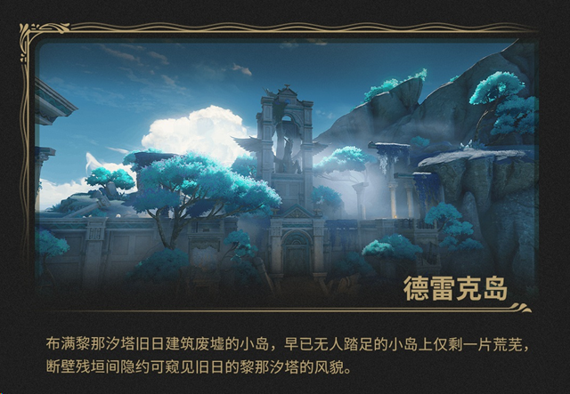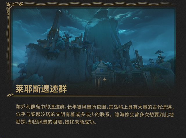4.莱耶斯遗迹群:充满古代遗迹的小岛,长期被风暴环绕,似乎隐藏着与黎那汐塔文明相关的秘密,隐海修会多次试图勘探均未成功。