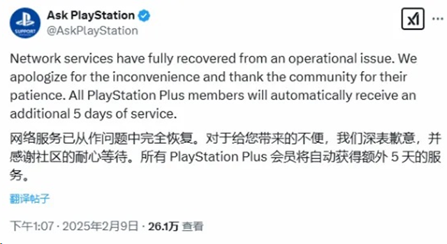 在服务恢复后,索尼PlayStation官方通过社交媒体向玩家表达了歉意,并宣布了补偿措施。根据官方公告,所有PlayStation Plus(PS+)会员将自动获得额外5天的服务时间。这一补偿措施旨在弥补玩家在宕机期间无法正常使用PS+服务的损失。