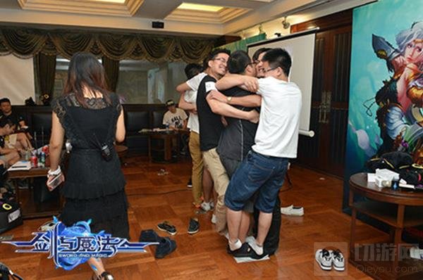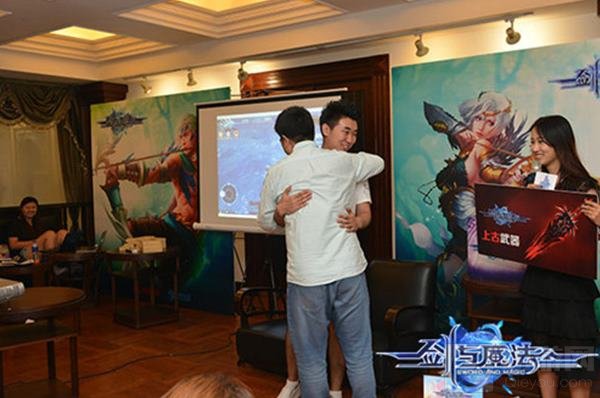 在见面会现场,有一幕不得不提起,那就是我们“剑魔”汉子们的基情抱抱了!相比是一直和基友们在游戏中玩抱抱,在现实的三次元这还是第一次!所以玩比较嗨,抱的也比较紧!通过这次踩报纸的游戏,我们“剑魔”的男勇士们完成了现实版“情缘任务”,也因此而获得了稀有奖励!