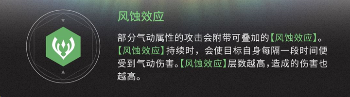部分气动属性的攻击会附带可叠加的风蚀效应。在风蚀效应持续期间,目标自身每隔一段时间便会受到气动伤害。风蚀效应的叠加层数越高,造成的伤害也就越高,为玩家提供了持续输出的机会。
