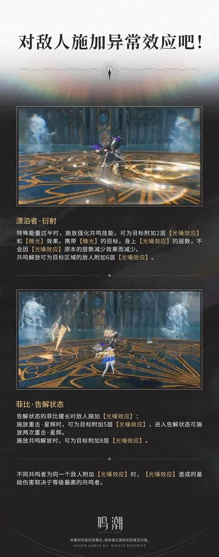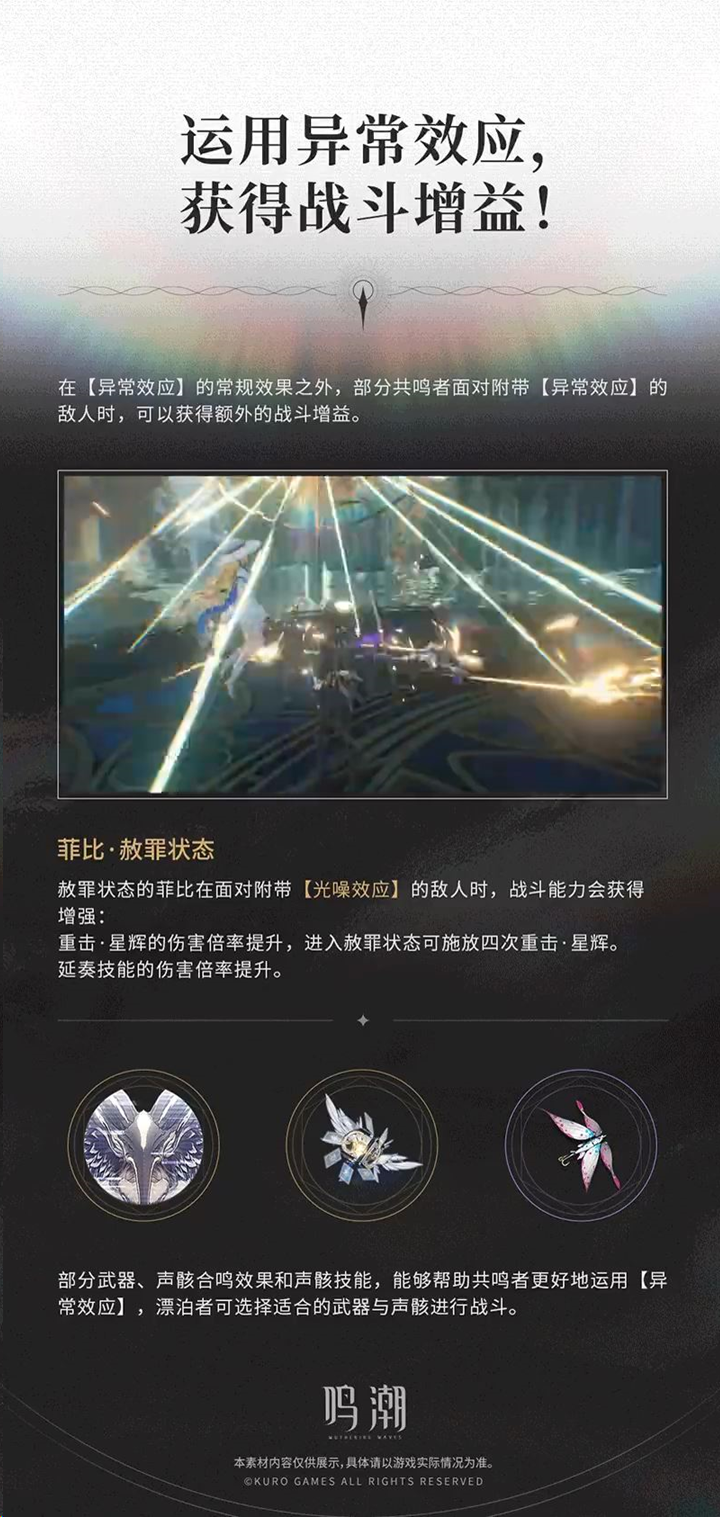 在战斗中,部分属性攻击会为目标附加【异常效应】。异常效应共有六种,不同的异常效应具有各自独特的效果。例如2.1版本即将登场的共鸣者菲比,还有漂泊者的衍射技能,都将能灵活运用【光噪效应】进行战斗,成为异常效应运用的典型代表。