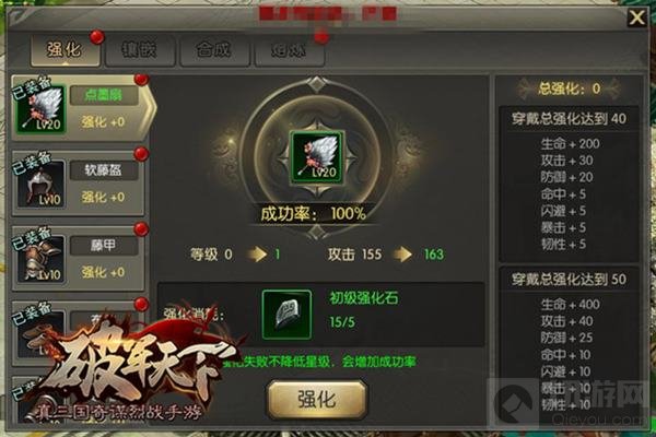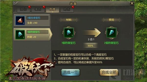 获得一套装备后不代表可以顺其自然,与培养人才相同,装备也在等待主人的悉心强化培养。装备是战场上必不可少的工具,追逐霸气道具是英雄们永远在追求的,在玩家角色达到24级时,系统将引导玩家对装备进行“镶嵌”,镶嵌宝石可使装备增加额外的属性。这时候,所镶嵌的宝石的等级就是大幅提升战力的关键,四个相同的低等宝石可以合成高等级宝石,镶嵌了宝石的装备将助玩家在战场上所向披靡。