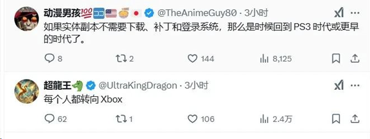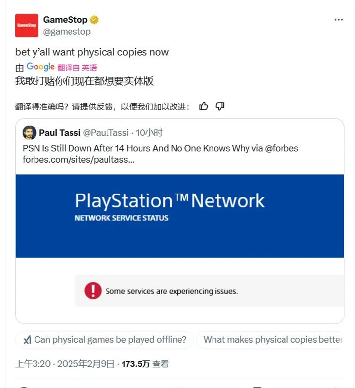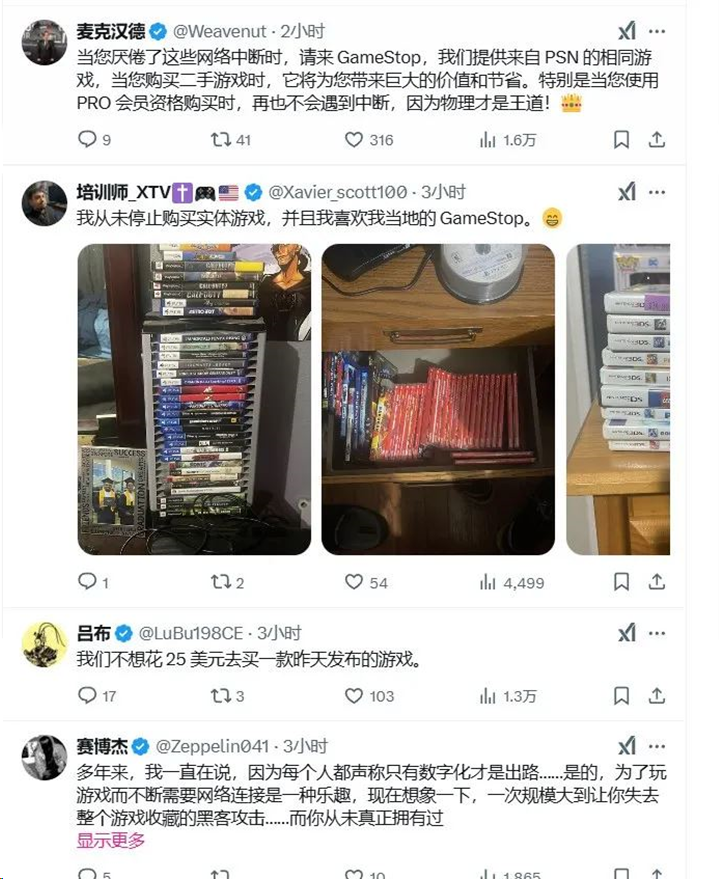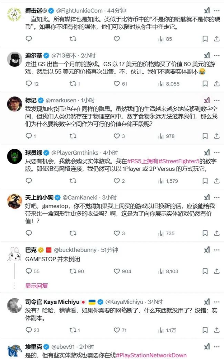 这一事件迅速在社交媒体上引发热议。实体游戏零售商GameStop更是在X平台上发推调侃道:“我敢打赌你们现在都想要实体游戏了吧。”这条推文迅速获得大量点赞和转发,不少玩家纷纷留言表示,“这就是为什么我坚持购买实体版”,还有玩家讽刺道,“如果你的游戏库都在云端,那么它们根本不属于你。”