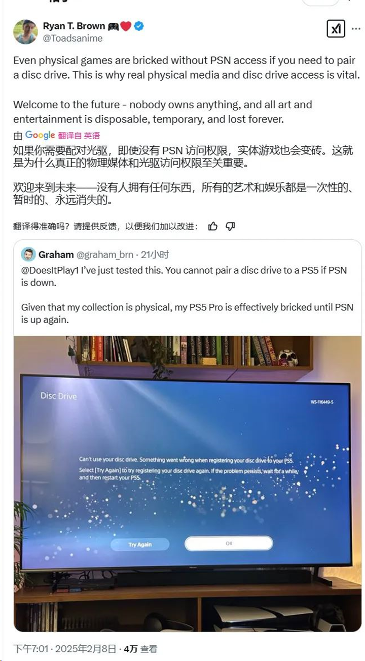 更令人惊讶的是,一些用户还报告称,即便是全数字版的PS5 Slim或PS5 Pro,连接外置光驱后也无法读取实体游戏碟,致使依赖数字版的玩家几乎完全失去访问自己游戏库的能力。