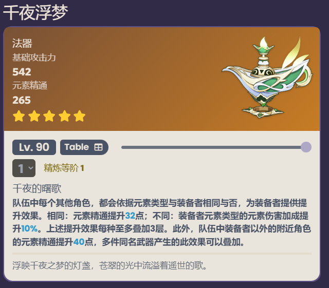 千夜浮梦可以提供大量元素精通,同时还能给队友带来一定的增益效果。如果你的瑞希主要作为扩散增伤工具人,这把武器的泛用性非常高,能够为全队提供可观的增伤。如果你没有专武,又想要一个全队辅助增伤的玩法,千夜浮梦是最好的替代品。