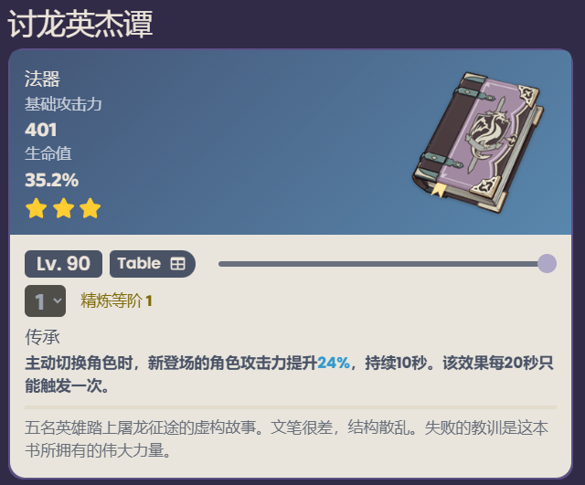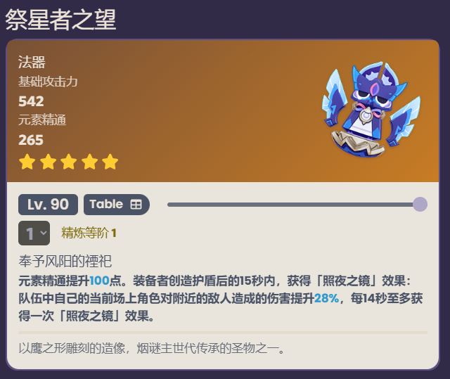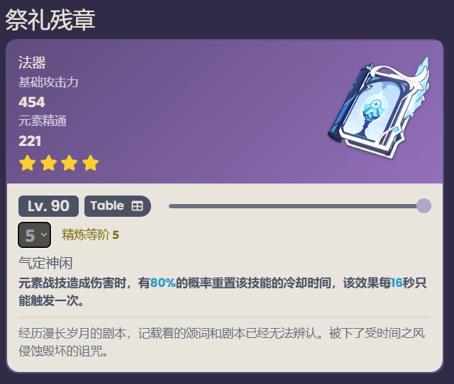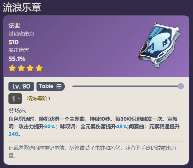 虽然这把武器的副属性是暴击伤害,不是瑞希最需要的元素精通,但它的增益效果中元素精通加成依然对瑞希有不错的提升。如果你缺乏高精通武器,或者希望瑞希有一定的短时间爆发,流浪乐章仍然是一个不错的选择。
