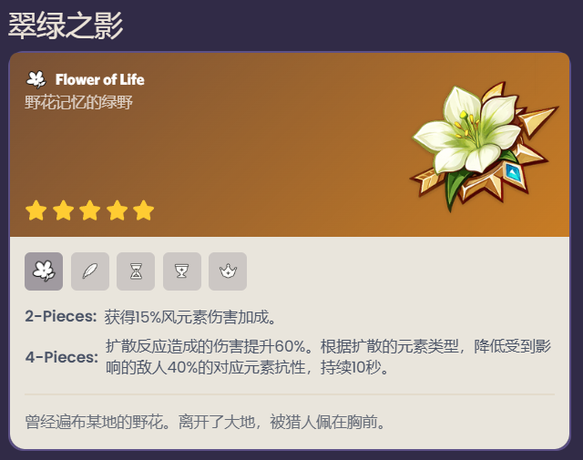 翠绿之影是风元素角色的通用毕业套装,适用于所有依赖扩散反应的角色,瑞希也不例外。她的战技提供高频扩散,而翠绿之影的4件套效果能大幅度提升扩散伤害,并削弱敌人的元素抗性,让全队输出更高。因此,如果你的瑞希作为扩散流站场C或辅助工具人,翠绿之影4件套是唯一正确的选择,没有替代方案。
