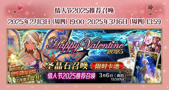 为了庆祝这一盛事,《FGO》还将开启情人节2025推荐召唤活动,自2025年2月13日(周四)19:00至2025年3月6日(周四)13:59,在此期间内,玩家可以通过圣晶石召唤来尝试获得限定角色和服务器专属奖励。