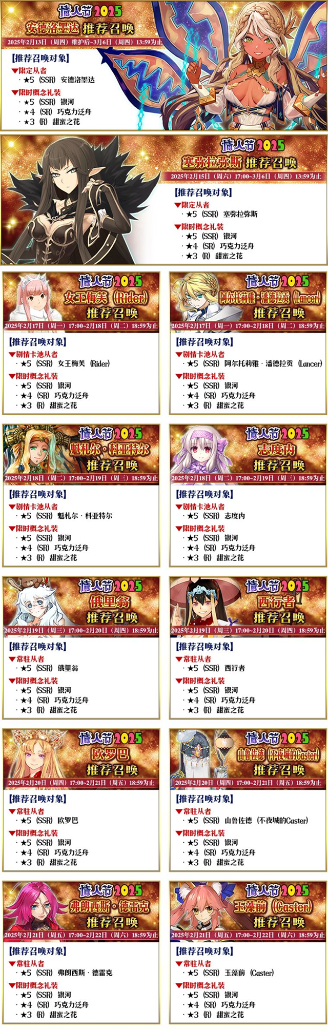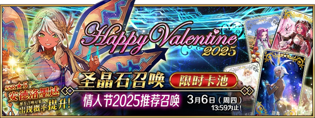 《命运-冠位指定》即《FGO》国服,为了庆祝限时活动「情人节2025~前往巧克力之河的尽头~」的开幕,本次推荐召唤将带来全新的限定从者「★5(SSR)安德洛墨达」和3种限时概念礼装。