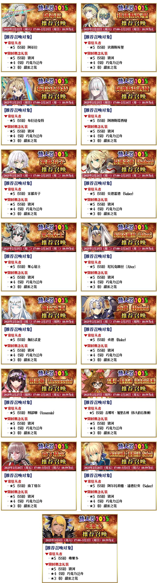 需要注意的是,以下限定从者只能在作为推荐召唤对象的卡池中进行召唤,且在本次推荐召唤结束后,这些从者不会加入剧情卡池: