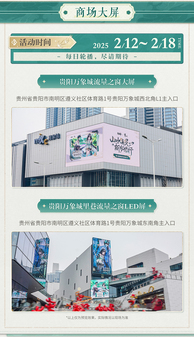 - 活动时间:从2025年2月12日至2月18日,贵阳万象城的两个重要位置——流量之窗大屏和里巷流量之窗LED屏将每日轮播此次活动的相关内容。具体地址如下: