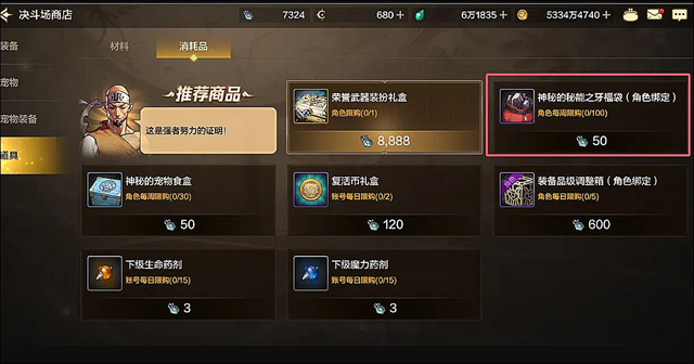 而这个福袋最多可以开到10个秘能之牙的,每个角色一个月最多可以买400个福袋,也就是说最多可以开到4000个秘能之牙了,这福利可能很多玩家错过了。另外决斗场商店也有很多其他值得购买的道具材料,有多余决斗币的玩家也可以兑换一些调整箱备用。