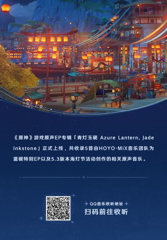 原神官方宣布今天发布了新的游戏原声EP专辑「青灯玉砚 Azure Lantern, Jade Inkstone」,收录了5.3版本的相关活动音乐原声,包括蓝砚特别EP、海灯节BGM等游戏音乐,共计5首。