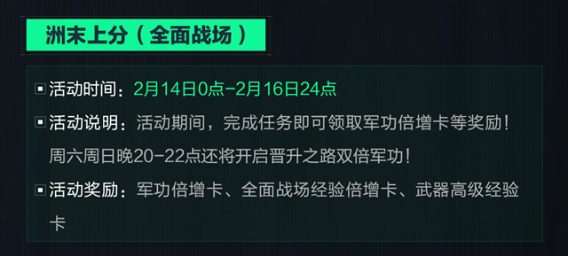 活动奖励: 军功倍增卡、全面战场经验倍增卡、武器高级经验卡。