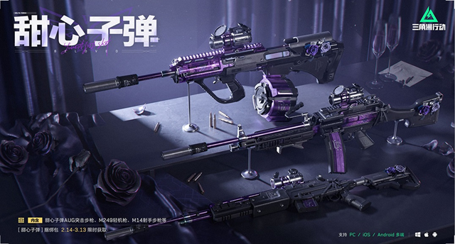 包含内容: 甜心子弹-AUG突击步枪、M14射手步枪、M249轻机枪、甜心子弹系列军牌、头像、喷漆。