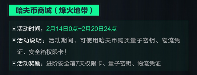 活动说明: 活动期间,可使用哈夫币购买量子密钥、物流凭证、安全箱权限卡。