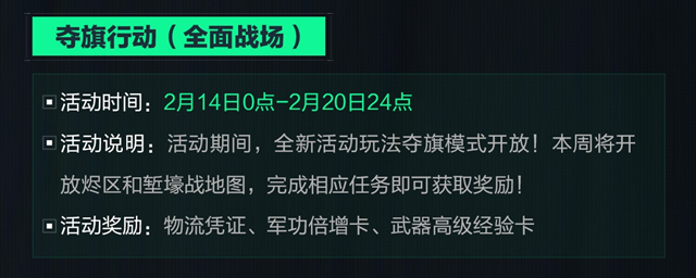 活动说明: 全新活动玩法夺旗模式开放,本周将开放烬区和堑壕战地图,完成相应任务即可获取奖励。